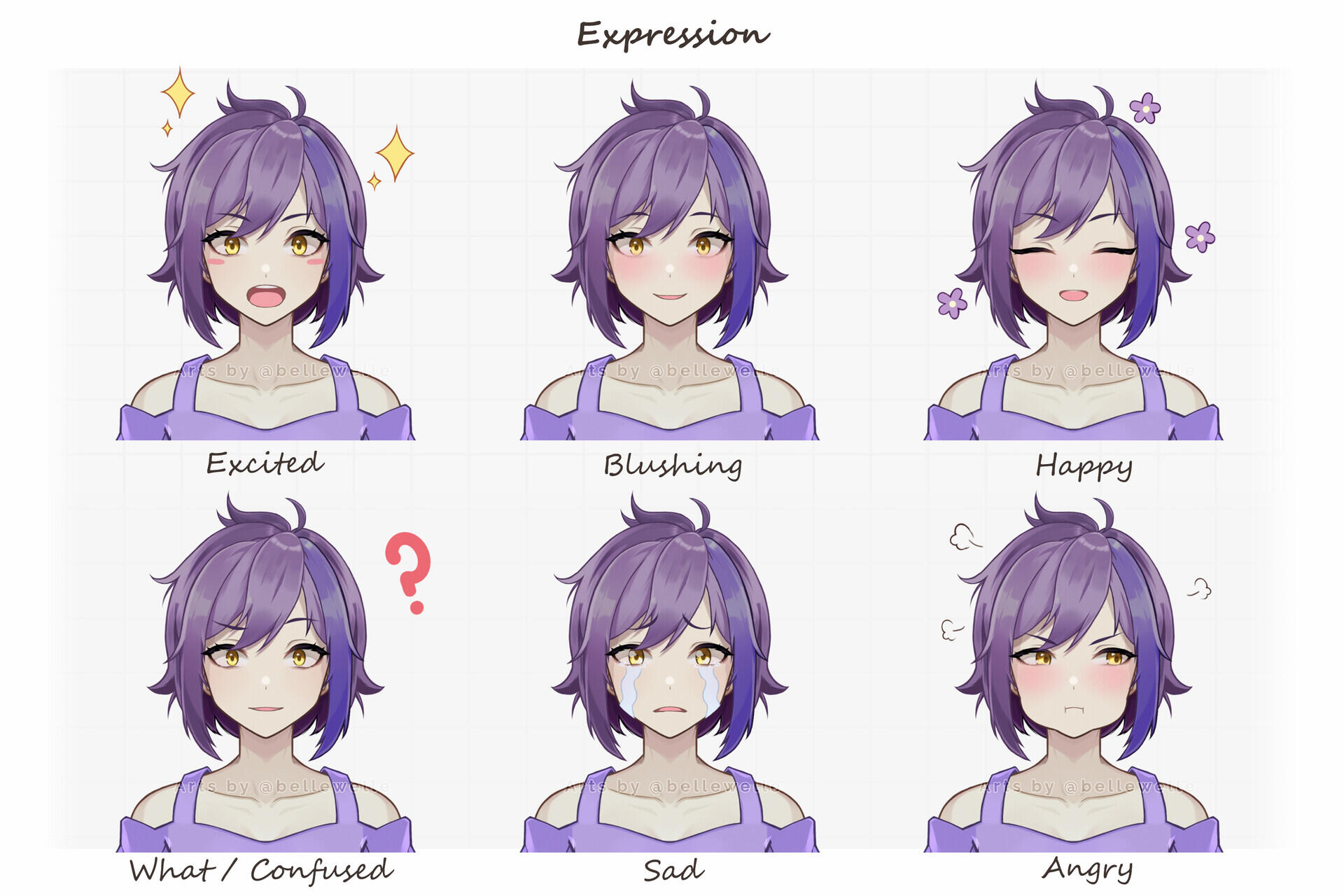Please note that the free base expressions (Happy, Sad, and Angry) don’t include any stickers or effects. Any stickers (like angry marks, hearts, etc.) or looping elements (like tears, sweat, etc.) added to these expressions will still be charged separately as sticker or animated expressions. There's no charge if you just want to add simple details like blush or face shadows (for angry, shocked, etc.). Please check this if you want to see more detail about the add on : Add on details